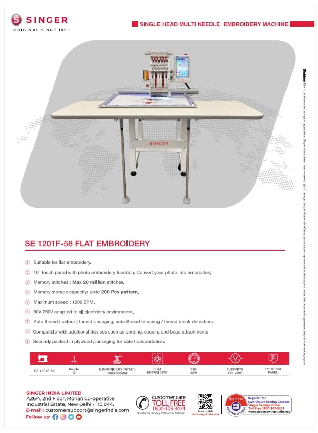 Singer SE-1201F-58 delivers reliable multi-needle embroidery, ideal for boutiques, tailoring units & embroidery businesses.